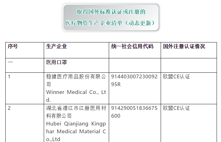 醫保商會(huì )推出取得國外標準認證或注冊的醫療物資和非醫用口罩生產(chǎn)企業(yè)清單